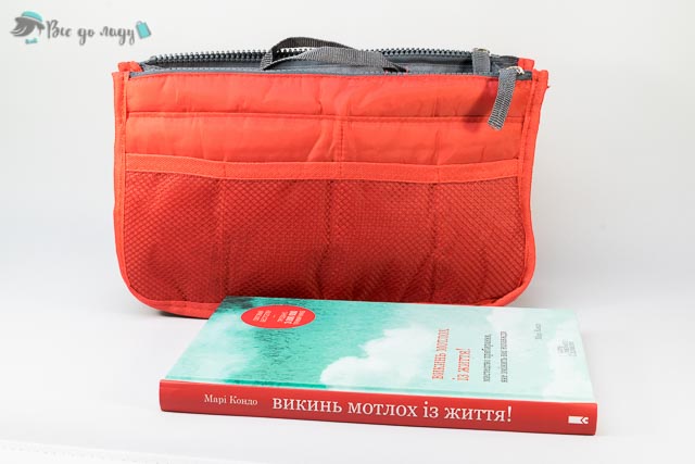 Комплект складається з органайзера для сумки і книги Марі Кондо "Викинь мотлох із життя!". Є відмінним варіантом для подарунка. Містить "теоретичну" і "практичну" частини
