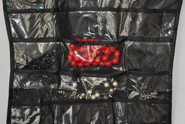Органайзер для прикрас і дрібниць допоможе навести порядок. Двосторонній, з одного боку прозорі кишеньки, з іншого петельки для підвісок.