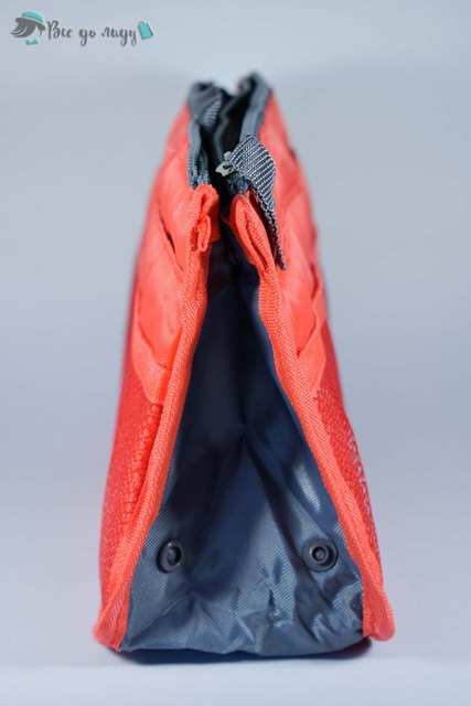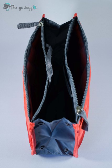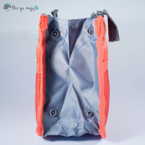 Має одне загальне відділення, ширина якого регулюється кнопками, два відділення на застібках "блискавка" та зовнішні кишеньки з обох боків, дві невеликі ручки.